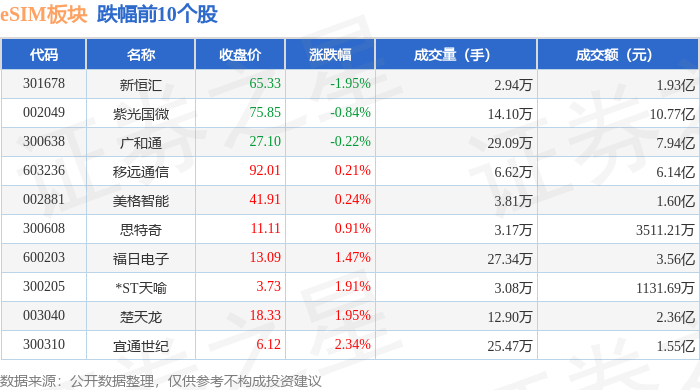 从资金流向上来看,当日eSIM板块主力资金净流入2.34亿元,游资资金净流出7595.28万元,散户资金净流出1.58亿元。eSIM板块个股资金流向见下表:
