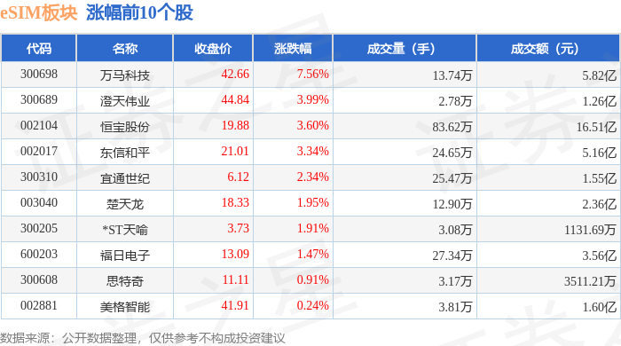 证券之星消息,12月19日eSIM板块较上一交易日上涨0.7%,万马科技领涨。当日上证指数报收于3890.45,上涨0.36%。深证成指报收于13140.22,上涨0.66%。eSIM板块个股涨跌见下表: