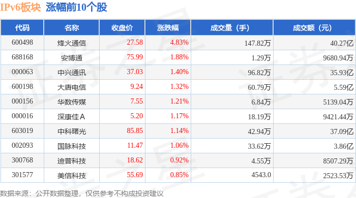 证券之星消息,12月19日IPv6板块较上一交易日上涨0.9%,烽火通信领涨。当日上证指数报收于3890.45,上涨0.36%。深证成指报收于13140.22,上涨0.66%。IPv6板块个股涨跌见下表: