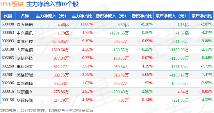 从资金流向上来看,当日IPv6板块主力资金净流入5.72亿元,游资资金净流出4.11亿元,散户资金净流出1.61亿元。IPv6板块个股资金流向见下表: