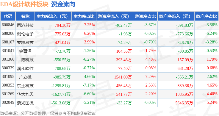 从资金流向上来看,当日EDA设计软件板块主力资金净流出8864.36万元,游资资金净流入2602.62万元,散户资金净流入6261.73万元。EDA设计软件板块个股资金流向见下表: