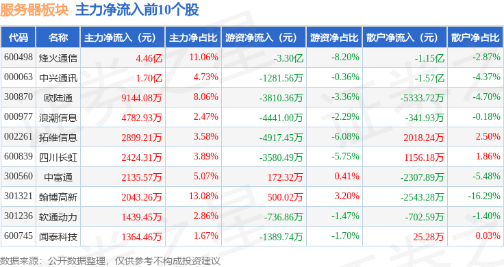 从资金流向上来看,当日服务器板块主力资金净流出7123.49万元,游资资金净流出5.05亿元,散户资金净流入5.76亿元。服务器板块个股资金流向见下表: