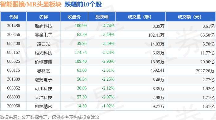从资金流向上来看,当日智能眼镜/MR头显板块主力资金净流出11.42亿元,游资资金净流入6.05亿元,散户资金净流入5.37亿元。智能眼镜/MR头显板块个股资金流向见下表: