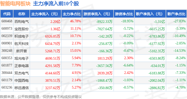 从资金流向上来看,当日智能电网板块主力资金净流出4.89亿元,游资资金净流出2.26亿元,散户资金净流入7.15亿元。智能电网板块个股资金流向见下表: