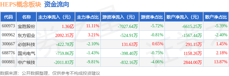 从资金流向上来看,当日HEPS概念板块主力资金净流入1.25亿元,游资资金净流出8651.48万元,散户资金净流出3889.29万元。HEPS概念板块个股资金流向见下表: