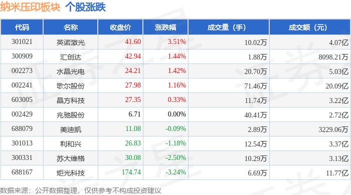 证券之星消息,12月19日纳米压印板块较上一交易日上涨0.5%,英诺激光领涨。当日上证指数报收于3890.45,上涨0.36%。深证成指报收于13140.22,上涨0.66%。纳米压印板块个股涨跌见下表:
