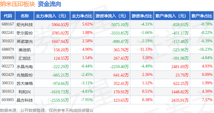 从资金流向上来看,当日纳米压印板块主力资金净流入4978.31万元,游资资金净流出9637.25万元,散户资金净流入4658.94万元。纳米压印板块个股资金流向见下表: