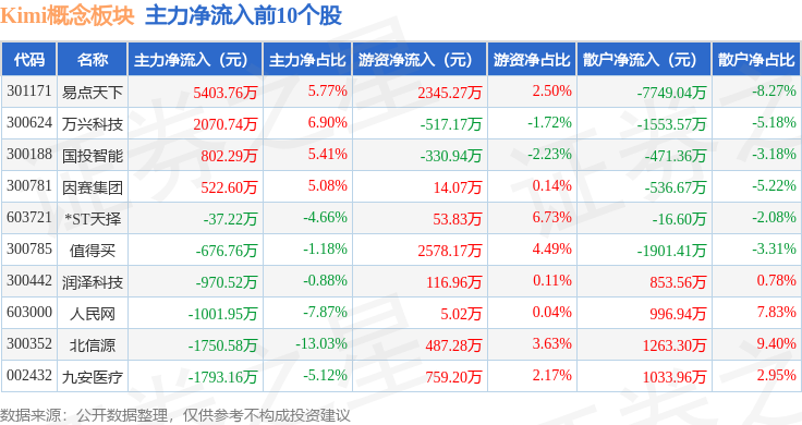 从资金流向上来看,当日Kimi概念板块主力资金净流出2.67亿元,游资资金净流入1.98亿元,散户资金净流入6881.91万元。Kimi概念板块个股资金流向见下表: