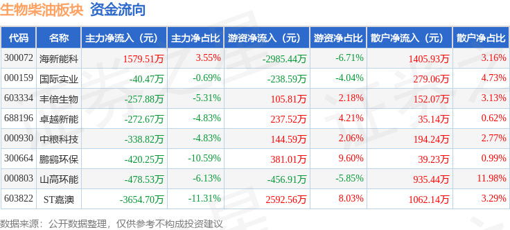 从资金流向上来看,当日生物柴油板块主力资金净流出3883.82万元,游资资金净流出219.43万元,散户资金净流入4103.25万元。生物柴油板块个股资金流向见下表: