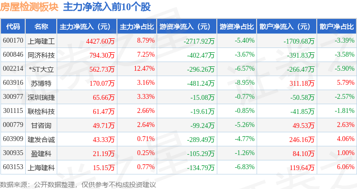 从资金流向上来看,当日房屋检测板块主力资金净流出4456.77万元,游资资金净流出1.05亿元,散户资金净流入1.5亿元。房屋检测板块个股资金流向见下表: