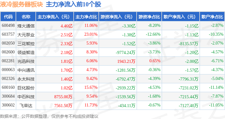 从资金流向上来看,当日液冷服务器板块主力资金净流入9.96亿元,游资资金净流出12.24亿元,散户资金净流入2.27亿元。液冷服务器板块个股资金流向见下表: