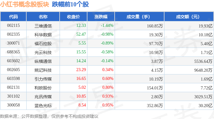 证券之星消息,12月19日小红书概念股板块较上一交易日上涨0.95%,荣信文化领涨。当日上证指数报收于3890.45,上涨0.36%。深证成指报收于13140.22,上涨0.66%。小红书概念股板块个股涨跌见下表:
