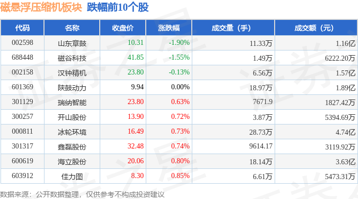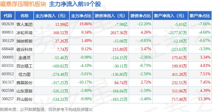 从资金流向上来看,当日磁悬浮压缩机板块主力资金净流入12.46亿元,游资资金净流出7.95亿元,散户资金净流出4.51亿元。磁悬浮压缩机板块个股资金流向见下表: