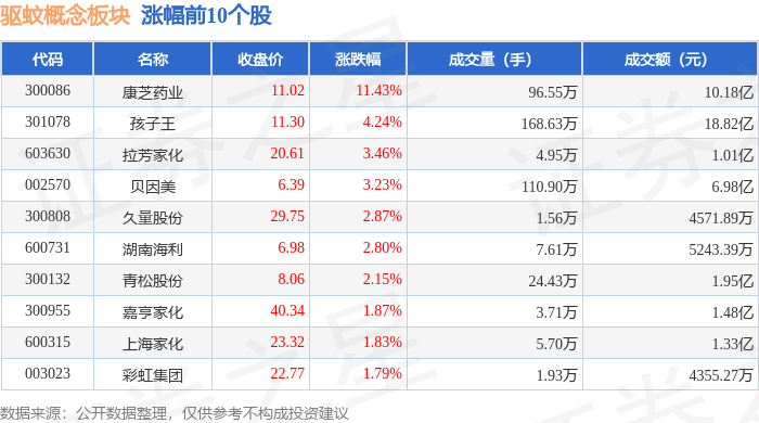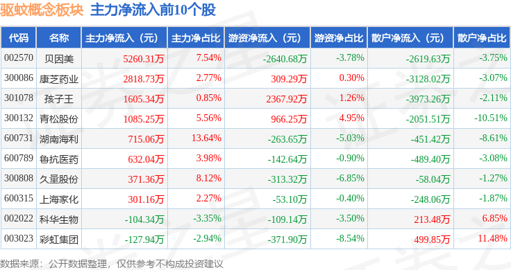 从资金流向上来看,当日驱蚊概念板块主力资金净流入8415.32万元,游资资金净流入252.41万元,散户资金净流出8667.73万元。驱蚊概念板块个股资金流向见下表: