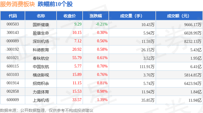 从资金流向上来看,当日服务消费板块主力资金净流入7.1亿元,游资资金净流出7.23亿元,散户资金净流入1308.57万元。服务消费板块个股资金流向见下表: