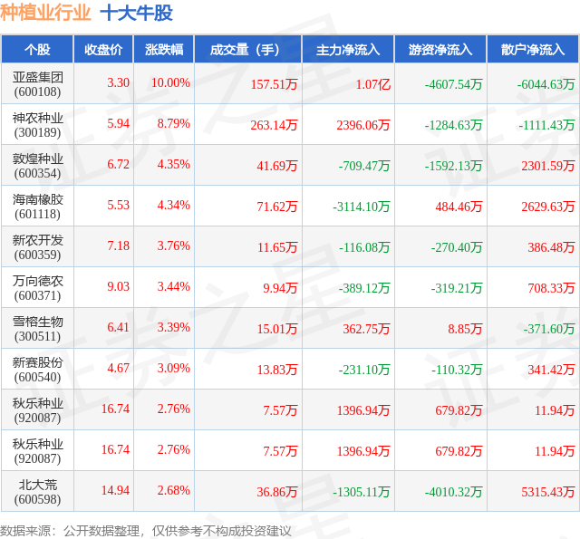 个股表现方面,种植业行业当日领涨股为亚盛集团(600108),该股当日报收3.3,上涨10.0%,成交量157.51万,主力资金净流入1.07亿元。神农种业(300189)以上涨8.79%紧随其后,该股当日成交量263.14万,主力资金净流入2396.06万元。除此之外,敦煌种业(600354)、海南橡胶(601118)、新农开发(600359)均进入当日牛股之列。具体个股列表见下表: