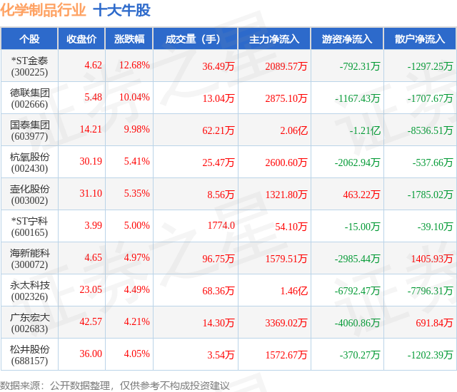 个股表现方面,化学制品行业当日领涨股为*ST金泰(300225),该股当日报收4.62,上涨12.68%,成交量36.49万,主力资金净流入2089.57万元。德联集团(002666)以上涨10.04%紧随其后,该股当日成交量13.04万,主力资金净流入2875.1万元。除此之外,国泰集团(603977)、杭氧股份(002430)、壶化股份(003002)均进入当日牛股之列。具体个股列表见下表: