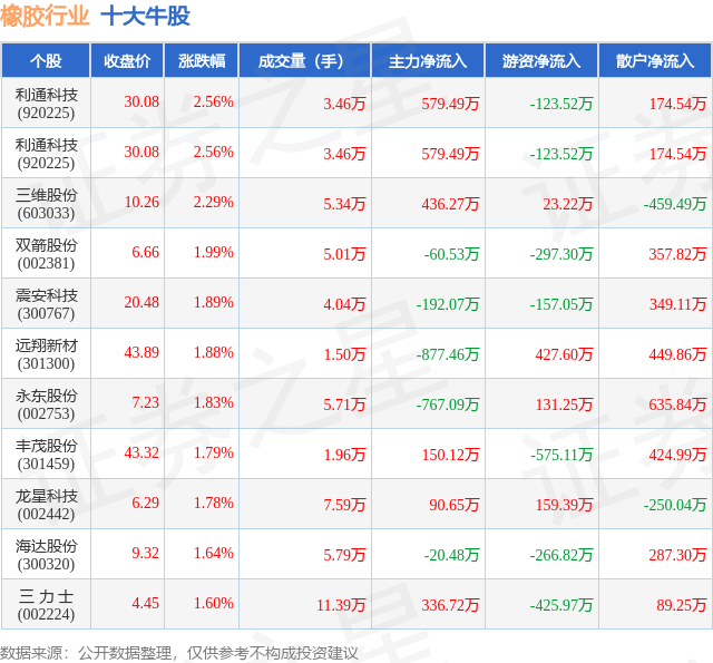 个股表现方面,橡胶行业当日领涨股为利通科技(920225),该股当日报收30.08,上涨2.56%,成交量3.46万,主力资金净流入579.49万元。利通科技(920225)以上涨2.56%紧随其后,该股当日成交量3.46万,主力资金净流入579.49万元。除此之外,三维股份(603033)、双箭股份(002381)、震安科技(300767)均进入当日牛股之列。具体个股列表见下表: