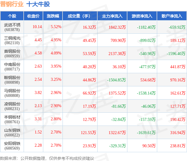 个股表现方面,普钢行业当日领涨股为武进不锈(603878),该股当日报收10.14,上涨5.52%,成交量16.32万,主力资金净流入1842.32万元。三钢闽光(002110)以上涨4.95%紧随其后,该股当日成交量49.45万,主力资金净流入709.9万元。除此之外,首钢股份(000959)、中南股份(000717)、鞍钢股份(000898)均进入当日牛股之列。具体个股列表见下表: