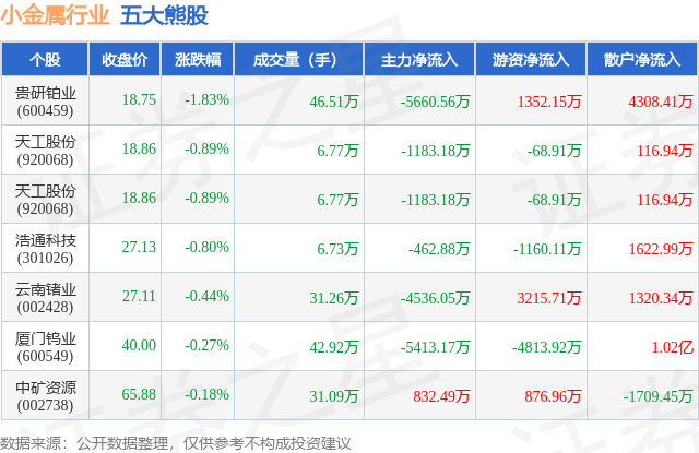 个股表现方面,小金属行业当日领跌股为贵研铂业(600459),该股当日报收18.75,下跌1.83%,成交量46.51万,主力资金净流出5660.56万元。天工股份(920068)以下跌0.89%紧随其后,该股当日成交量6.77万,主力资金净流出1183.18万元。除此之外,天工股份(920068)、浩通科技(301026)、云南锗业(002428)均进入当日熊股之列。具体个股列表见下表: