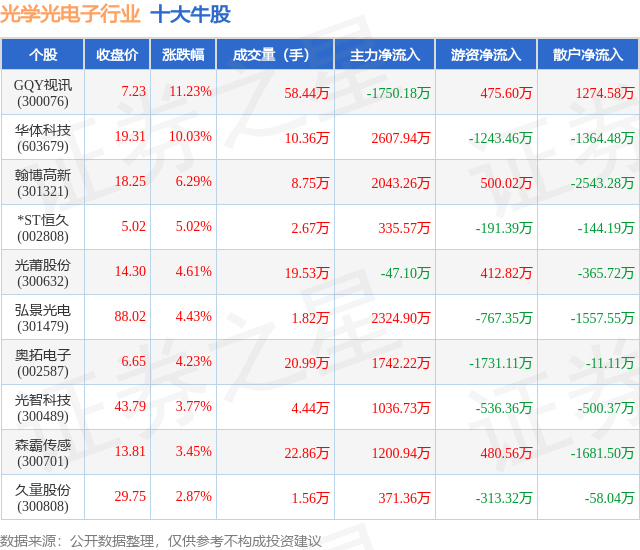 个股表现方面,光学光电子行业当日领涨股为GQY视讯(300076),该股当日报收7.23,上涨11.23%,成交量58.44万,主力资金净流出1750.18万元。华体科技(603679)以上涨10.03%紧随其后,该股当日成交量10.36万,主力资金净流入2607.94万元。除此之外,翰博高新(301321)、*ST恒久(002808)、光莆股份(300632)均进入当日牛股之列。具体个股列表见下表: