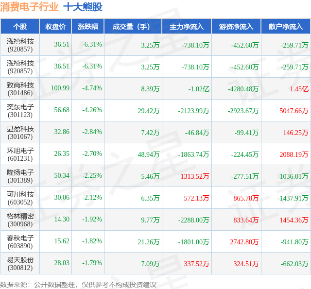 个股表现方面,消费电子行业当日领跌股为泓禧科技(920857),该股当日报收36.51,下跌6.31%,成交量3.25万,主力资金净流出738.1万元。泓禧科技(920857)以下跌6.31%紧随其后,该股当日成交量3.25万,主力资金净流出738.1万元。除此之外,致尚科技(301486)、奕东电子(301123)、显盈科技(301067)均进入当日熊股之列。具体个股列表见下表: