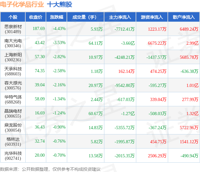 个股表现方面,电子化学品行业当日领跌股为思泉新材(301489),该股当日报收187.69,下跌4.43%,成交量5.93万,主力资金净流出7712.41万元。南大光电(300346)以下跌3.53%紧随其后,该股当日成交量64.11万,主力资金净流出3.66亿元。除此之外,上海新阳(300236)、天承科技(688603)、容大感光(300576)均进入当日熊股之列。具体个股列表见下表: