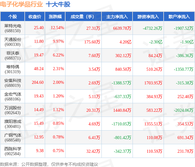 个股表现方面,电子化学品行业当日领涨股为莱特光电(688150),该股当日报收25.4,上涨12.54%,成交量27.31万,主力资金净流入6639.78万元。天通股份(600330)以上涨9.97%紧随其后,该股当日成交量175.6万,主力资金净流入4.2亿元。除此之外,菲沃泰(688371)、唯特偶(301319)、安集科技(688019)均进入当日牛股之列。具体个股列表见下表: