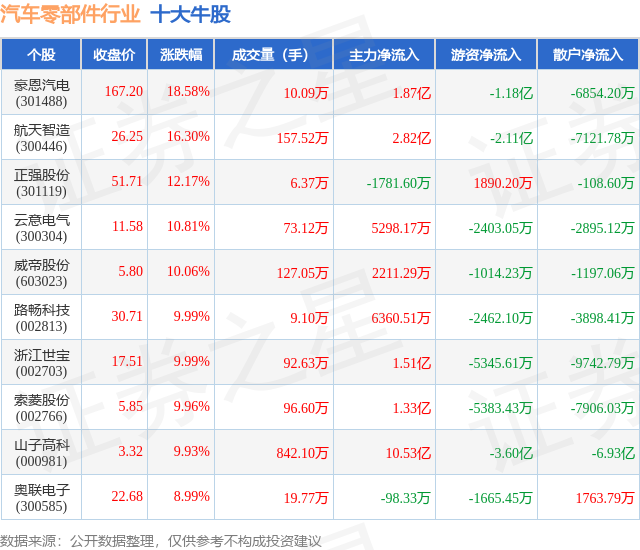 个股表现方面,汽车零部件行业当日领涨股为豪恩汽电(301488),该股当日报收167.2,上涨18.58%,成交量10.09万,主力资金净流入1.87亿元。航天智造(300446)以上涨16.3%紧随其后,该股当日成交量157.52万,主力资金净流入2.82亿元。除此之外,正强股份(301119)、云意电气(300304)、威帝股份(603023)均进入当日牛股之列。具体个股列表见下表:
