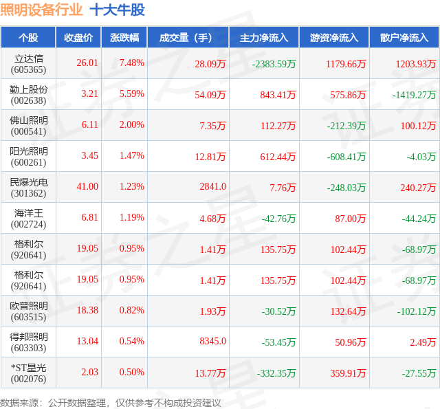 个股表现方面,照明设备行业当日领涨股为立达信(605365),该股当日报收26.01,上涨7.48%,成交量28.09万,主力资金净流出2383.59万元。勤上股份(002638)以上涨5.59%紧随其后,该股当日成交量54.09万,主力资金净流入843.41万元。除此之外,佛山照明(000541)、阳光照明(600261)、民爆光电(301362)均进入当日牛股之列。具体个股列表见下表: