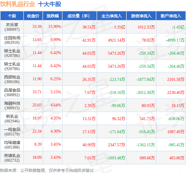 个股表现方面,饮料乳品行业当日领涨股为欢乐家(300997),该股当日报收33.39,上涨15.9%,成交量38.51万,主力资金净流入1.35亿元。庄园牧场(002910)以上涨9.99%紧随其后,该股当日成交量42.91万,主力资金净流入4921.14万元。除此之外,骑士乳业(920786)、骑士乳业(920786)、西部牧业(300106)均进入当日牛股之列。具体个股列表见下表: