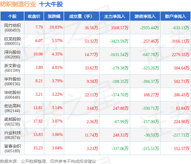 个股表现方面,纺织制造行业当日领涨股为凤竹纺织(600493),该股当日报收7.79,上涨10.03%,成交量36.56万,主力资金净流入3568.57万元。欣龙控股(000955)以上涨5.57%紧随其后,该股当日成交量53.32万,主力资金净流出3423.59万元。除此之外,浔兴股份(002098)、浙文影业(601599)、华升股份(600156)均进入当日牛股之列。具体个股列表见下表: