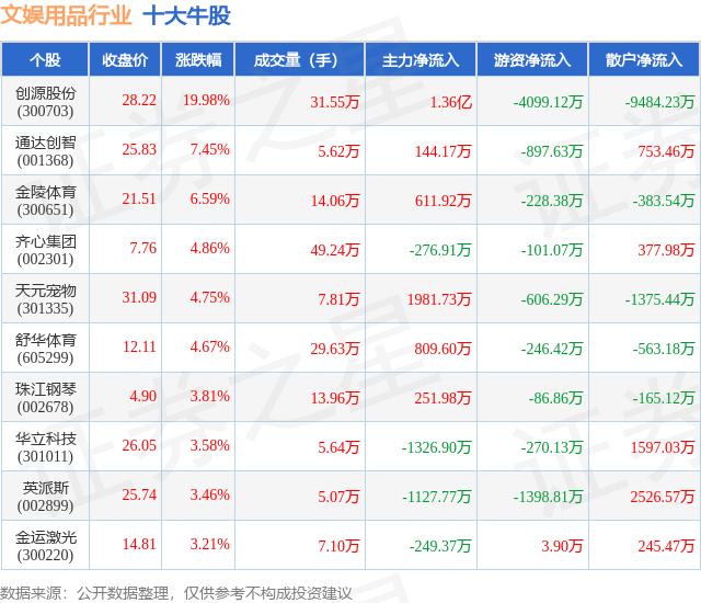 个股表现方面,文娱用品行业当日领涨股为创源股份(300703),该股当日报收28.22,上涨19.98%,成交量31.55万,主力资金净流入1.36亿元。通达创智(001368)以上涨7.45%紧随其后,该股当日成交量5.62万,主力资金净流入144.17万元。除此之外,金陵体育(300651)、齐心集团(002301)、天元宠物(301335)均进入当日牛股之列。具体个股列表见下表: