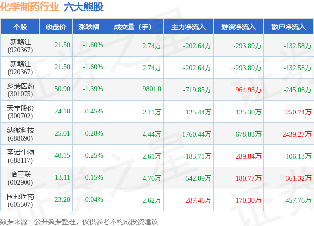 个股表现方面,化学制药行业当日领跌股为新赣江(920367),该股当日报收21.5,下跌1.6%,成交量2.74万,主力资金净流出202.64万元。新赣江(920367)以下跌1.6%紧随其后,该股当日成交量2.74万,主力资金净流出202.64万元。除此之外,多瑞医药(301075)、天宇股份(300702)、纳微科技(688690)均进入当日熊股之列。具体个股列表见下表: