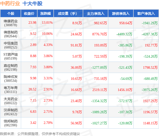 个股表现方面,中药行业当日领涨股为维康药业(300878),该股当日报收23.98,上涨13.01%,成交量8.91万,主力资金净流入982.65万元。佛慈制药(002644)以上涨10.06%紧随其后,该股当日成交量24.66万,主力资金净流入8776.7万元。除此之外,中恒集团(600252)、ST葫芦娃(605199)、嘉应制药(002198)均进入当日牛股之列。具体个股列表见下表: