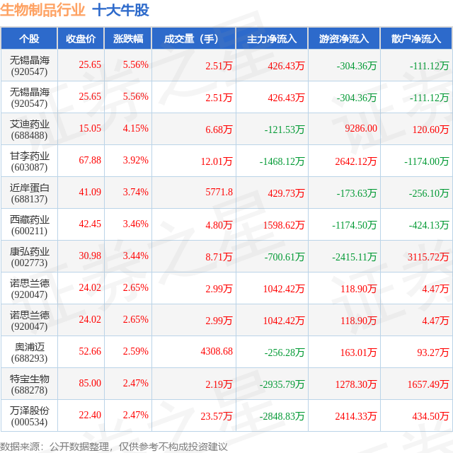 个股表现方面,生物制品行业当日领涨股为无锡晶海(920547),该股当日报收25.65,上涨5.56%,成交量2.51万,主力资金净流入426.43万元。无锡晶海(920547)以上涨5.56%紧随其后,该股当日成交量2.51万,主力资金净流入426.43万元。除此之外,艾迪药业(688488)、甘李药业(603087)、近岸蛋白(688137)均进入当日牛股之列。具体个股列表见下表: