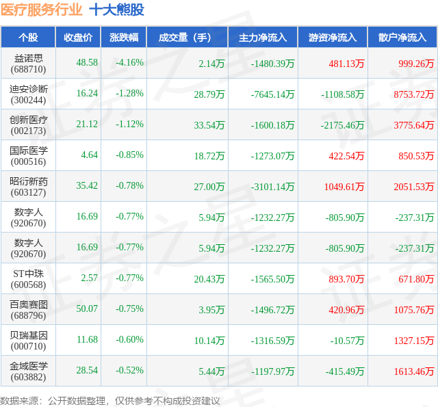 个股表现方面,医疗服务行业当日领跌股为益诺思(688710),该股当日报收48.58,下跌4.16%,成交量2.14万,主力资金净流出1480.39万元。迪安诊断(300244)以下跌1.28%紧随其后,该股当日成交量28.79万,主力资金净流出7645.14万元。除此之外,创新医疗(002173)、国际医学(000516)、昭衍新药(603127)均进入当日熊股之列。具体个股列表见下表: