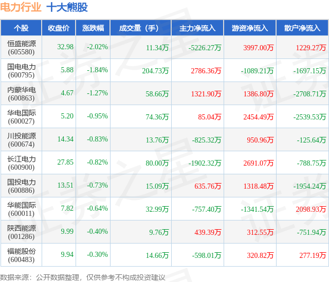个股表现方面,电力行业当日领跌股为恒盛能源(605580),该股当日报收32.98,下跌2.02%,成交量11.34万,主力资金净流出5226.27万元。国电电力(600795)以下跌1.84%紧随其后,该股当日成交量204.73万,主力资金净流入2786.36万元。除此之外,内蒙华电(600863)、华电国际(600027)、川投能源(600674)均进入当日熊股之列。具体个股列表见下表:
