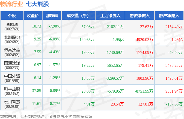 个股表现方面,物流行业当日领跌股为普路通(002769),该股当日报收10.73,下跌7.9%,成交量57.08万,主力资金净流出2182.11万元。龙洲股份(002682)以下跌6.09%紧随其后,该股当日成交量190.65万,主力资金净流出1.95亿元。除此之外,恒基达鑫(002492)、圆通速递(600233)、中国外运(601598)均进入当日熊股之列。具体个股列表见下表: