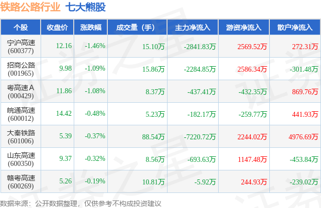 个股表现方面,铁路公路行业当日领跌股为宁沪高速(600377),该股当日报收12.16,下跌1.46%,成交量15.1万,主力资金净流出2841.83万元。招商公路(001965)以下跌1.09%紧随其后,该股当日成交量15.86万,主力资金净流出2284.85万元。除此之外,粤高速A(000429)、皖通高速(600012)、大秦铁路(601006)均进入当日熊股之列。具体个股列表见下表: