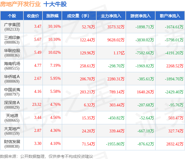 个股表现方面,房地产开发行业当日领涨股为广宇集团(002133),该股当日报收3.47,上涨10.16%,成交量52.76万,主力资金净流入3573.32万元。三湘印象(000863)以上涨10.1%紧随其后,该股当日成交量122.44万,主力资金净流入9628.02万元。除此之外,华联控股(000036)、海南机场(600515)、华侨城A(000069)均进入当日牛股之列。具体个股列表见下表: