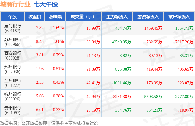 个股表现方面,城商行行业当日领涨股为厦门银行(601187),该股当日报收7.82,上涨1.69%,成交量15.99万,主力资金净流出404.74万元。苏州银行(002966)以上涨1.68%紧随其后,该股当日成交量60.04万,主力资金净流出8549.95万元。除此之外,西安银行(600928)、郑州银行(002936)、兰州银行(001227)均进入当日牛股之列。具体个股列表见下表: