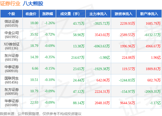 个股表现方面,证券行业当日领跌股为信达证券(601059),该股当日报收18.0,下跌1.26%,成交量43.75万,主力资金净流出3925.72万元。中金公司(601995)以下跌0.72%紧随其后,该股当日成交量58.9万,主力资金净流入3543.02万元。除此之外,XD首创证(601136)、东兴证券(601198)、中泰证券(600918)均进入当日熊股之列。具体个股列表见下表: