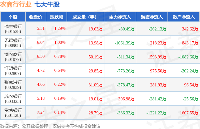 个股表现方面,农商行行业当日领涨股为瑞丰银行(601528),该股当日报收5.51,上涨1.29%,成交量19.63万,主力资金净流出80.49万元。无锡银行(600908)以上涨1.0%紧随其后,该股当日成交量13.98万,主力资金净流出1061.39万元。除此之外,渝农商行(601077)、江阴银行(002807)、张家港行(002839)均进入当日牛股之列。具体个股列表见下表: