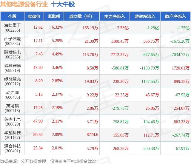 个股表现方面,其他电源设备行业当日领涨股为海陆重工(002255),该股当日报收12.62,上涨6.32%,成交量165.19万,主力资金净流入2.53亿元。西子洁能(002534)以上涨5.29%紧随其后,该股当日成交量21.39万,主力资金净流入1108.45万元。除此之外,融发核电(002366)、爱科赛博(688719)、绿能慧充(600212)均进入当日牛股之列。具体个股列表见下表: