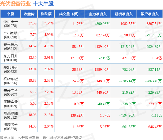 个股表现方面,光伏设备行业当日领涨股为快可电子(301278),该股当日报收37.39,上涨7.54%,成交量11.76万,主力资金净流出4890.06万元。*ST沐邦(603398)以上涨4.99%紧随其后,该股当日成交量12.3万,主力资金净流入827.74万元。除此之外,赛伍技术(603212)、东方日升(300118)、爱旭股份(600732)均进入当日牛股之列。具体个股列表见下表:
