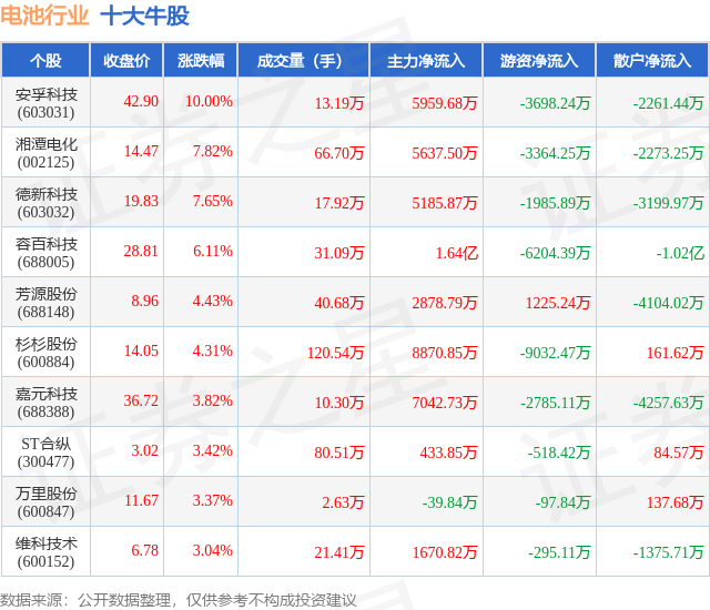 个股表现方面,电池行业当日领涨股为安孚科技(603031),该股当日报收42.9,上涨10.0%,成交量13.19万,主力资金净流入5959.68万元。湘潭电化(002125)以上涨7.82%紧随其后,该股当日成交量66.7万,主力资金净流入5637.5万元。除此之外,德新科技(603032)、容百科技(688005)、芳源股份(688148)均进入当日牛股之列。具体个股列表见下表: