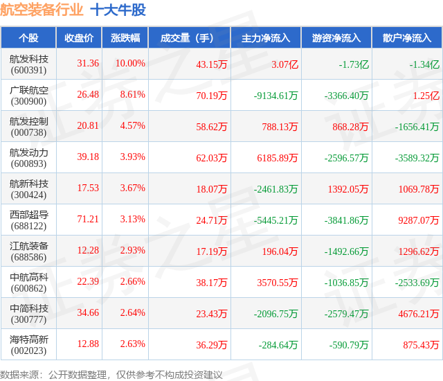 个股表现方面,航空装备行业当日领涨股为航发科技(600391),该股当日报收31.36,上涨10.0%,成交量43.15万,主力资金净流入3.07亿元。广联航空(300900)以上涨8.61%紧随其后,该股当日成交量70.19万,主力资金净流出9134.61万元。除此之外,航发控制(000738)、航发动力(600893)、航新科技(300424)均进入当日牛股之列。具体个股列表见下表: