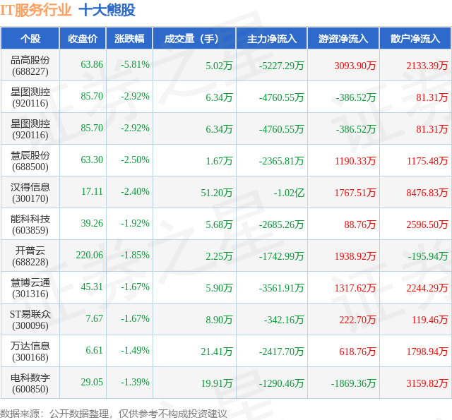 个股表现方面,IT服务行业当日领跌股为品高股份(688227),该股当日报收63.86,下跌5.81%,成交量5.02万,主力资金净流出5227.29万元。星图测控(920116)以下跌2.92%紧随其后,该股当日成交量6.34万,主力资金净流出4760.55万元。除此之外,星图测控(920116)、慧辰股份(688500)、汉得信息(300170)均进入当日熊股之列。具体个股列表见下表: