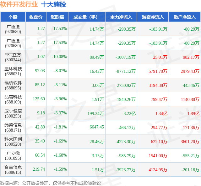 个股表现方面,软件开发行业当日领跌股为广道退(920680),该股当日报收1.27,下跌17.53%,成交量14.74万,主力资金净流出299.35万元。广道退(920680)以下跌17.53%紧随其后,该股当日成交量14.74万,主力资金净流出299.35万元。除此之外,*ST立方(300344)、星环科技(688031)、福昕软件(688095)均进入当日熊股之列。具体个股列表见下表: